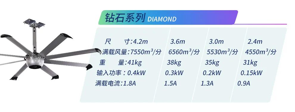 例如在一個2000平方米的空間,希望達到全面覆蓋的效果,需要小型風扇約70臺,而鉆石系列風扇僅需5臺。