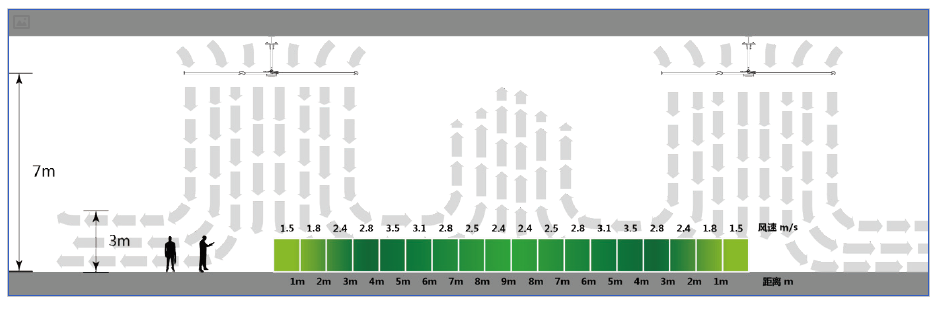 送風距離超過整個籃球場長度,達到36m以上;在36m的距離范圍內,風速從7m/s到0.9m/s(距離越遠,風速越低);